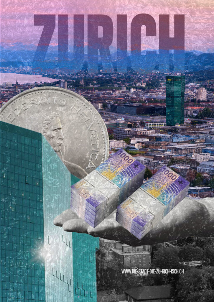 Das Postkartenmotiv “ZURICH” spielt mit den Klischees rund um die Stadt Zürich und die Schweiz. Es verbindet verschiedene grafische Elemente, um eine kritische, aber zugleich humorvolle Neuinterpretation zu schaffen. Das Hauptmotiv ist eine Fotocollage, die Zürich auf surreale Weise darstellt.